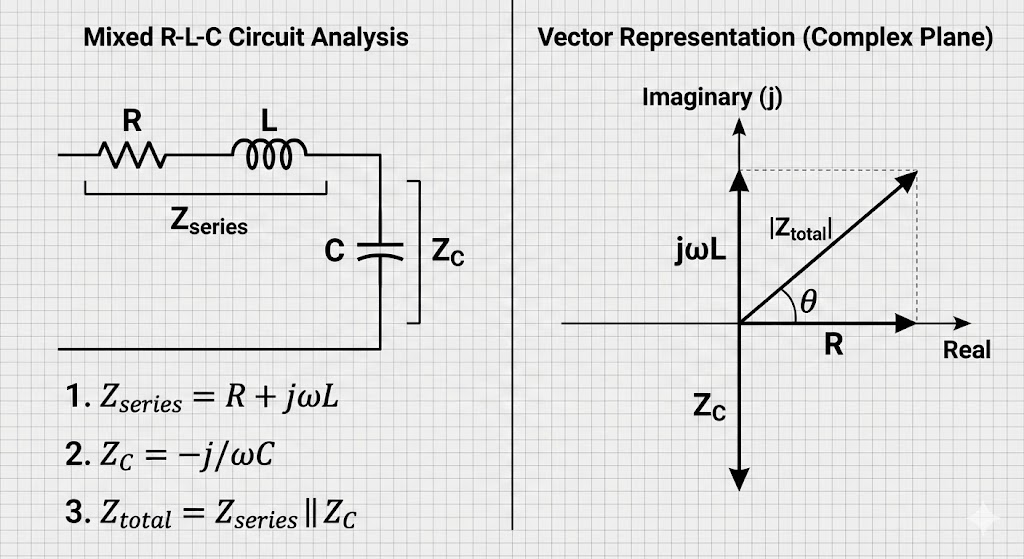 실제 회로에서는 R, L, C가 복합적으로 섞여 있습니다. 예를 들어 저항 R과 인덕터 L이 직렬로 연결된 뭉치가 있고, 이것이 다시 커패시터 C와 병렬로 연결된 형태를 해석해야 할 때가 많습니다.