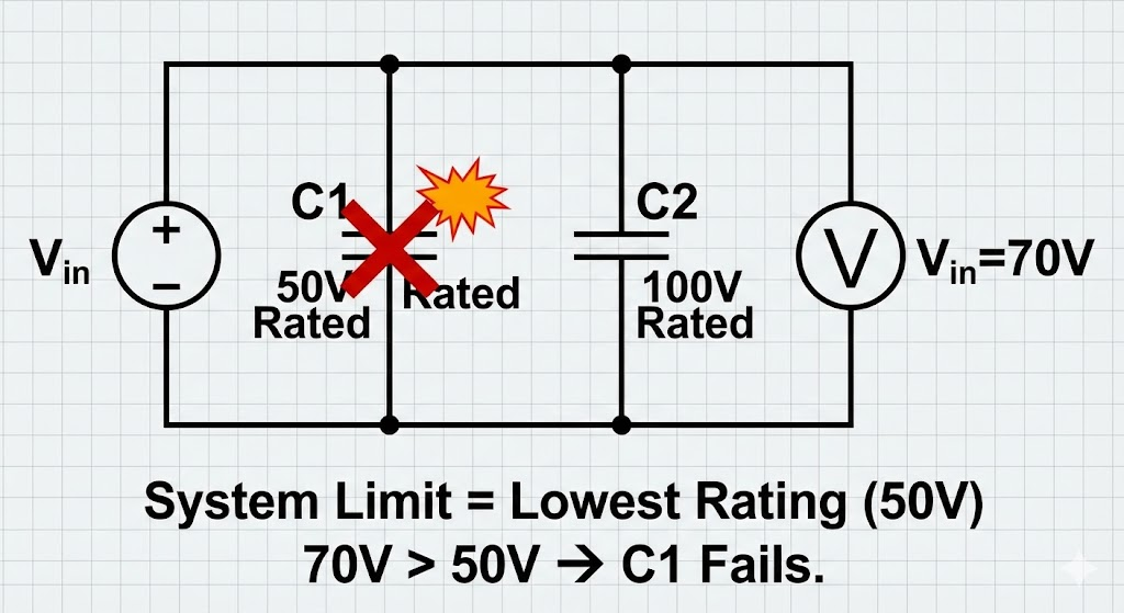 병렬 회로에서는 모든 커패시터에 동일한 전압이 걸립니다. 예를 들어 50V 내전압을 가진 커패시터와 100V 내전압을 가진 커패시터를 병렬로 연결했다면, 이 회로 전체의 내전압은 가장 낮은 수치인 50V가 됩니다. 100V짜리가 있다고 안심하고 70V를 인가하는 순간, 50V 규격의 커패시터는 과도한 에너지를 견디지 못하고 폭발하게 됩니다.