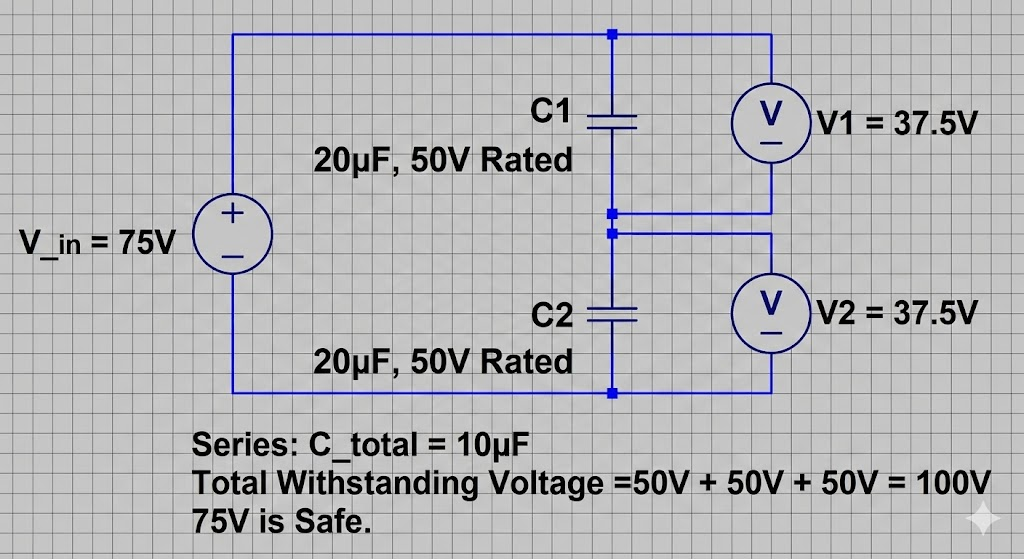 만약 20uF 50V 규격의 커패시터 두 개를 직렬로 연결하면, 전체 정전용량은 10uF로 줄어들지만 전체 회로가 견딜 수 있는 내전압은 100V로 늘어납니다. 만약 75V 전압이 인가된다면 각 커패시터에는 절반인 37.5V씩 걸리게 되어 안전하게 동작합니다. 고전압 회로에서 낮은 내전압의 커패시터를 여러 개 이어 붙여 사용하는 이유가 바로 여기에 있습니다.